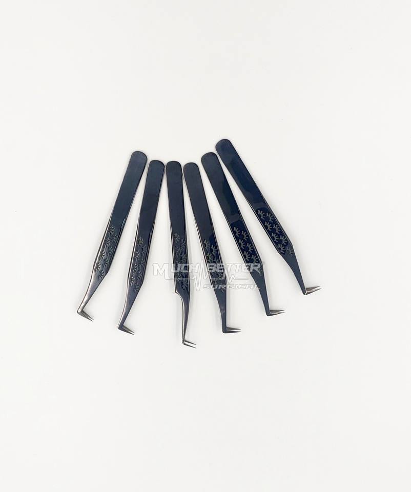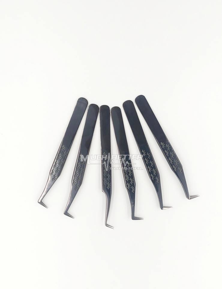 Pinzas de pestañas procesionales de plasma negro hechas a mano 100% que tienen pinzas de pestañas de mejor agarre de color plasma con mango de impresión de pestañas