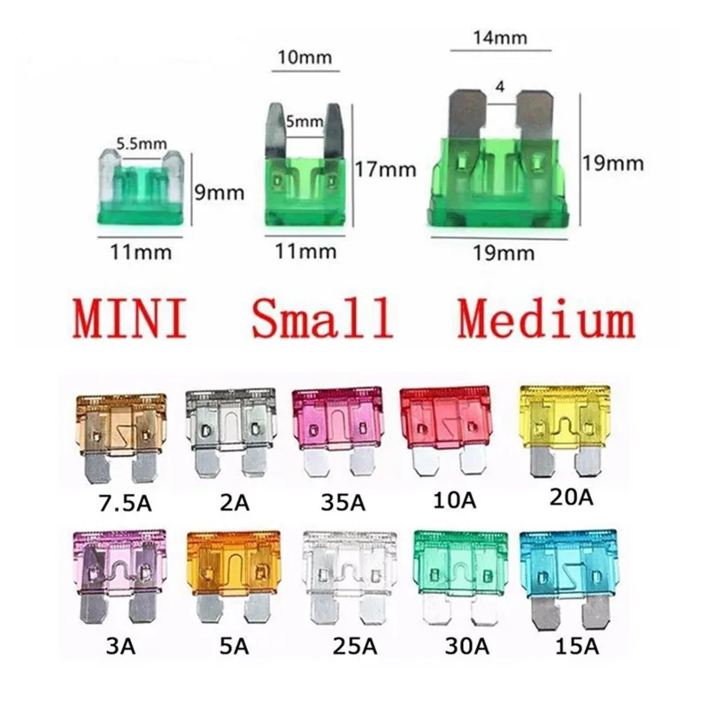 100PCS = Caja Fusibles automáticos Agregar un circuito ATO Mediano Pequeño Mini fusible 2A 3A 5A 7.5A 10A 15A 20A 25A 30A 35A 40A AUTO Cajas de fusibles para automóviles