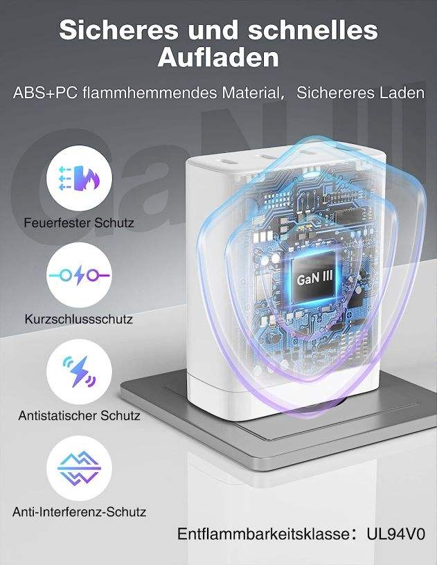C1& C2: 5V 3A,9V 3A,12V 3A,15V 3A,20V 5A 100W, C3: 5V 3A,9V 2A,12V 1.67A 20W, USB-A: 5V 3A,9V 2A,12V 1.5A 18WSalida