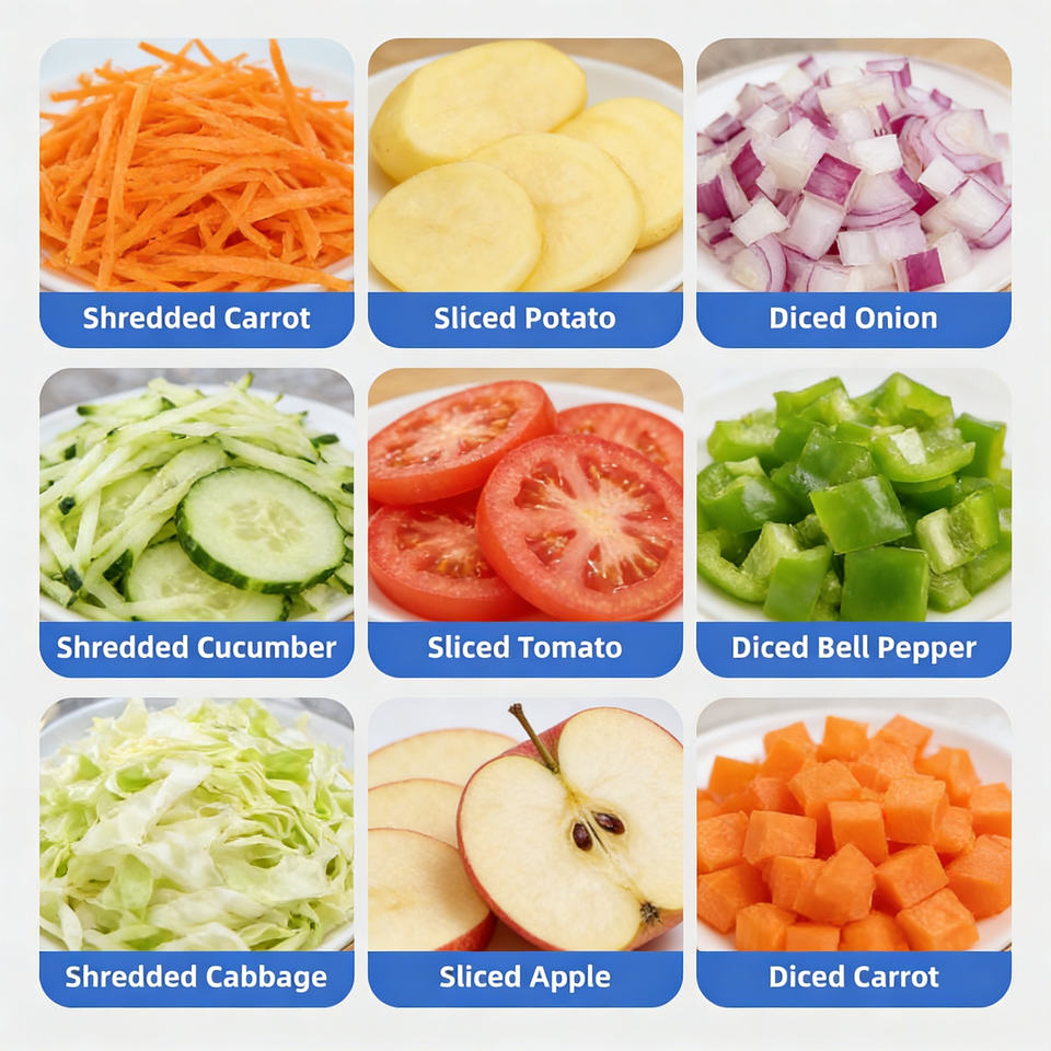 Nombre del producto de salida:Verduras ralladas, verduras en dados, verduras en rodajas.