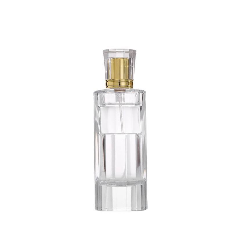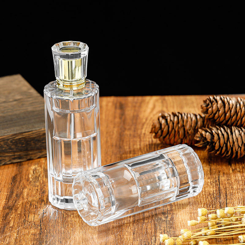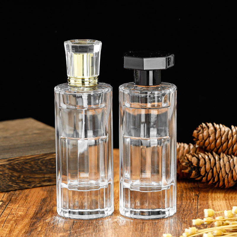 Botella de Vidrio Transparente Redonda con Rayas Verticales de 100 ml, Botella de Perfume Recargable de Alta Gama con Pulverizador a Presión