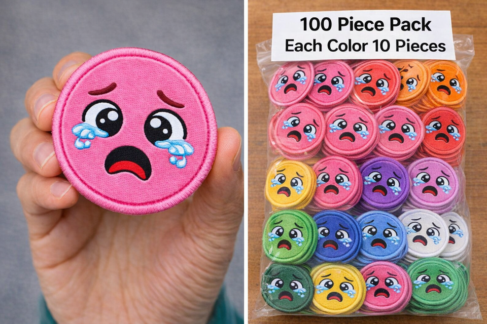 100 parches bordados de caras lloronas surtidas, 10 unidades de cada color, insignias coloridas termoadhesivas o para coser para ropa, bolsos y gorras