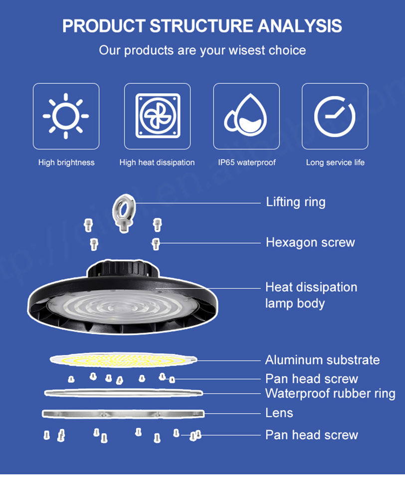 100W 150W 200W LED High Bay Lámparas industriales Luz de almacén de OVNI brillante con cuerpo de aluminio IP65 para aplicaciones de fábrica