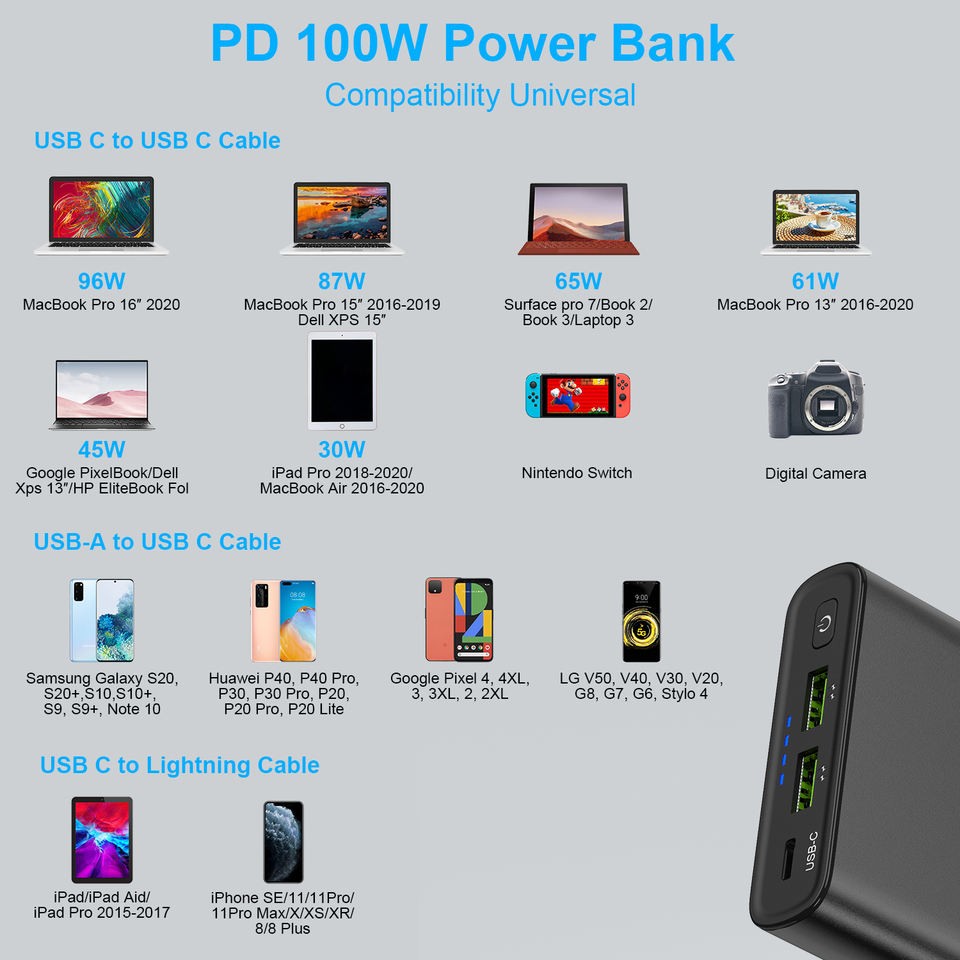 Batería Externa Portátil Powdiary de 100w PD QC3.0 con USB C para Laptop y Notebook, 26800mah, Decoración para Habitación, Tipo C Universal
