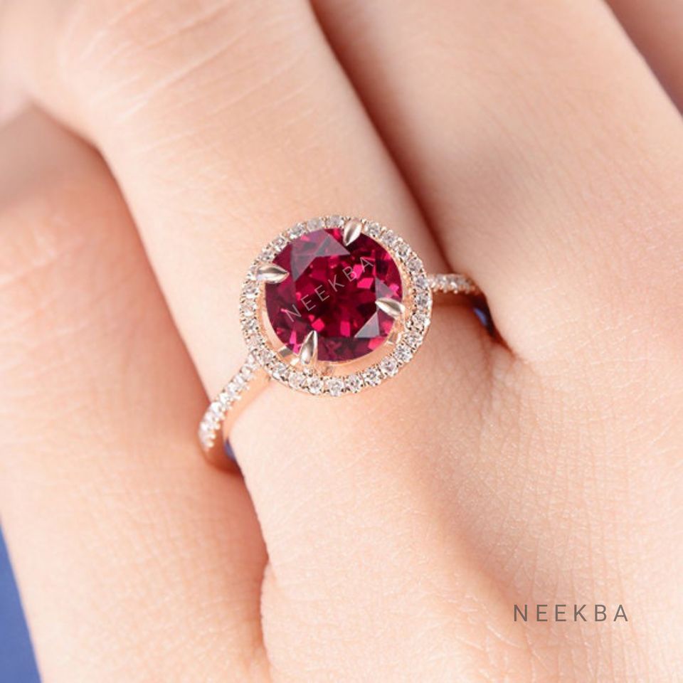 Anillo de rubí cultivado en laboratorio de corte redondo de oro macizo de 10K para bodas y compromisos, anillo de Halo de rubí Art Deco con opción de reemplazo de piedras preciosas