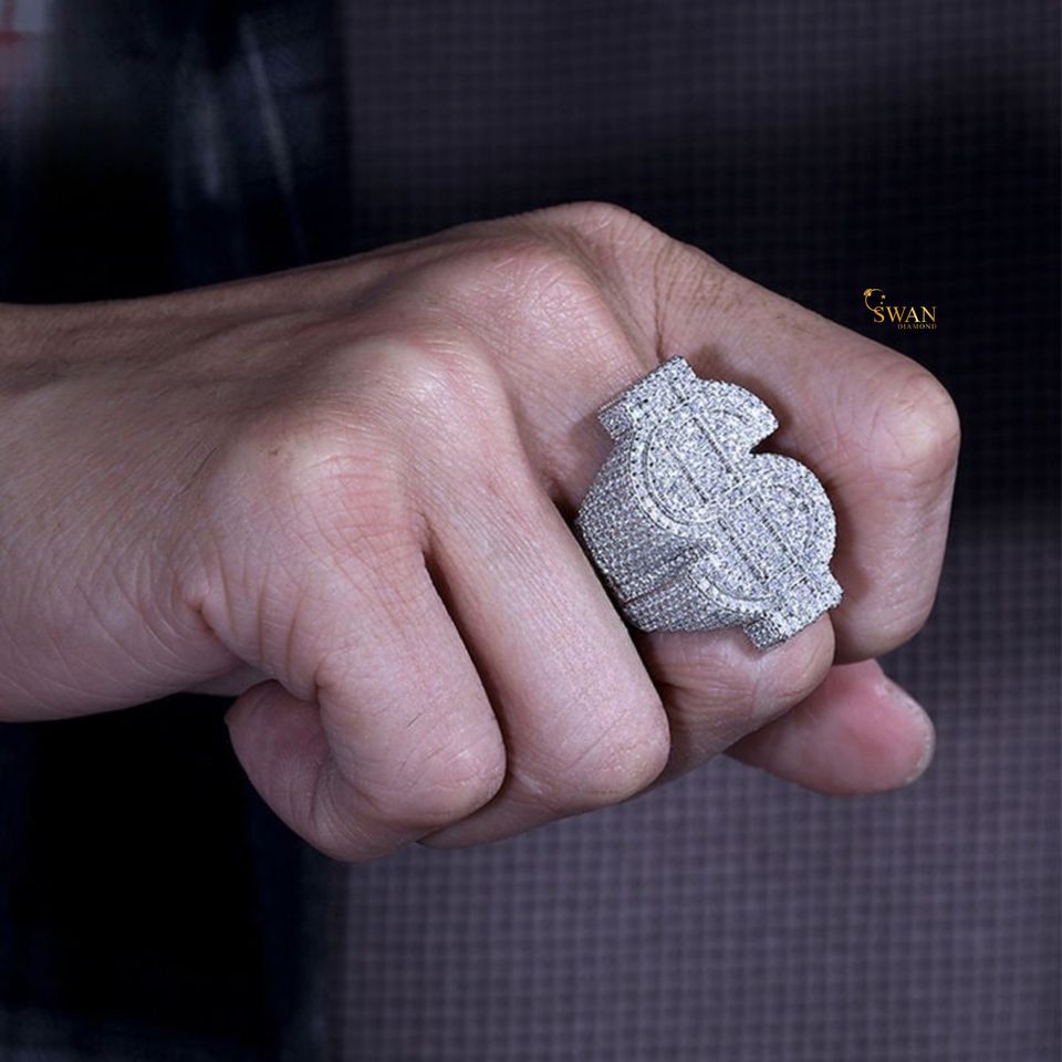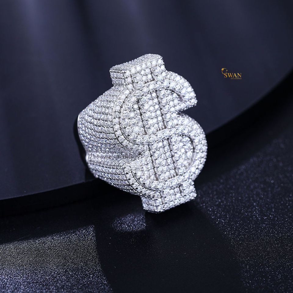 Anillo de signo de dólar de diamante cultivado en laboratorio de oro blanco sólido de 10K, joyería de Hip Hop, anillo ostentoso de declaración de moda para hombres y mujeres