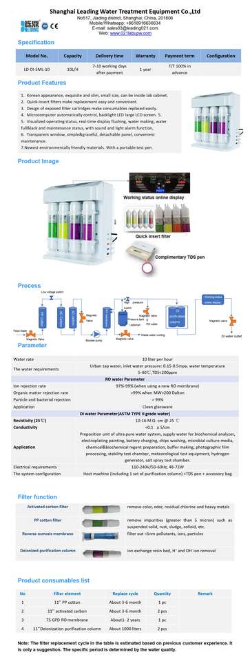 Máquina de destilación de agua de 10L/hora Rendimiento RO Desionizador Destilado DI Tipo II Máquina de fabricación de agua destilada