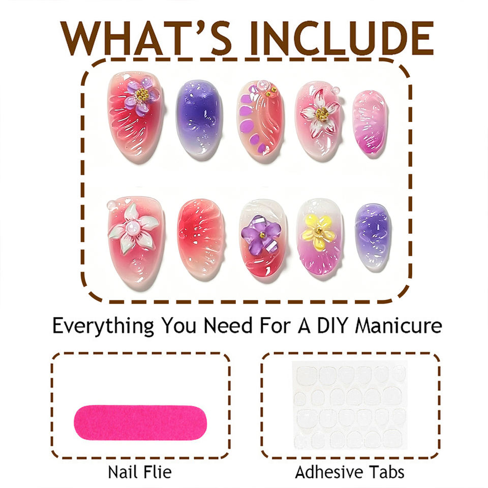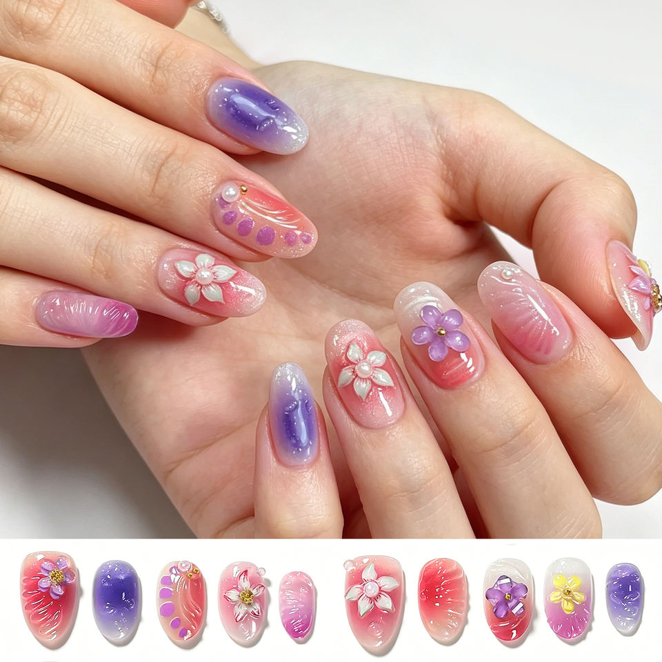 10 Uñas Postizas Cortas con Degradado Rosa y Morado, Forma Ovalada XS, Diseño de Concha de Sirena, Brillantes y con Purpurina