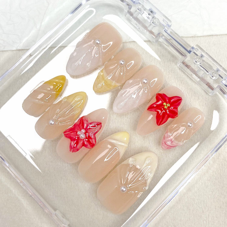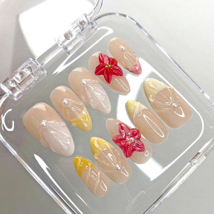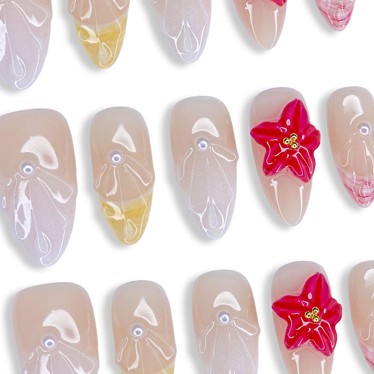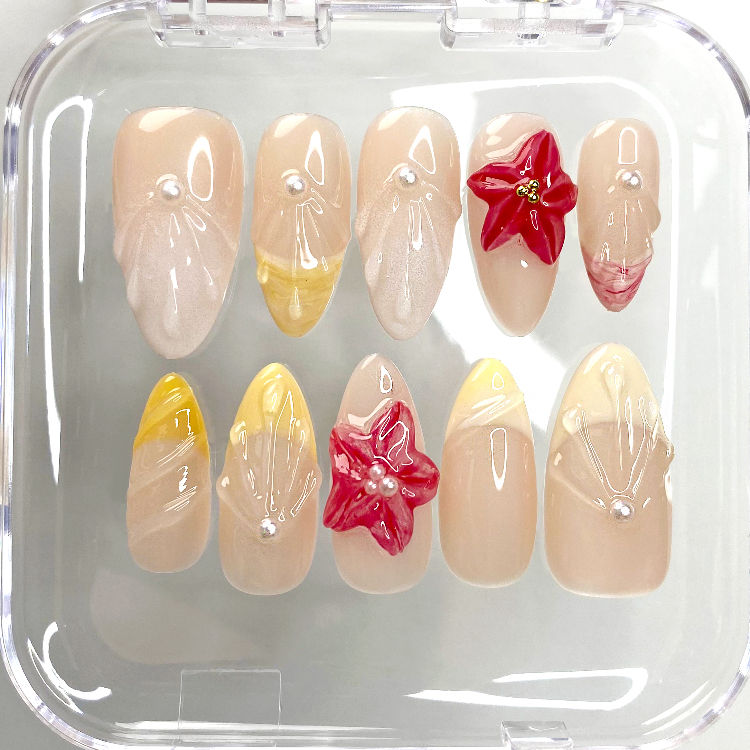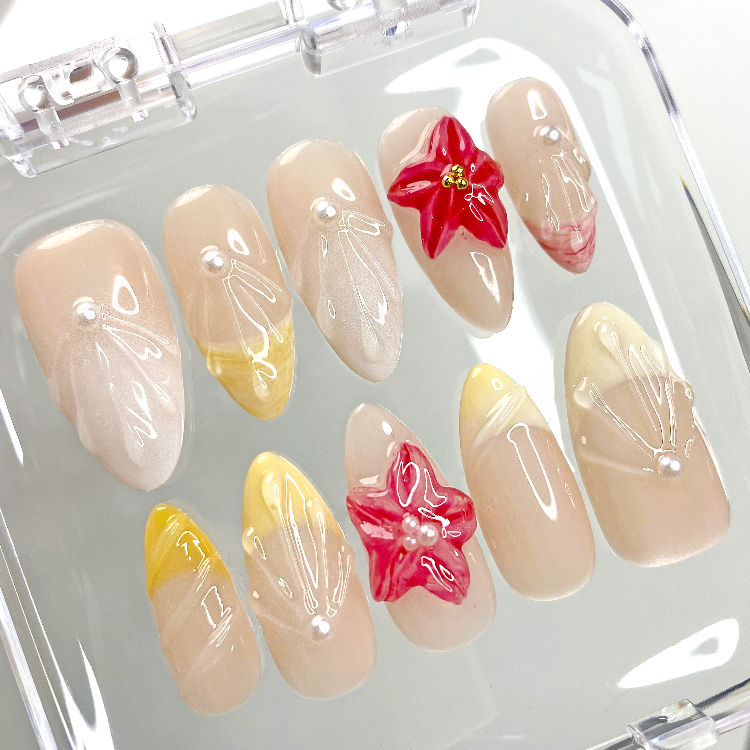 10 Uds prensa en las uñas manicura hecha a mano uñas de almendra medianas verano lindas nuevas mujeres artículos de Venta caliente uñas de concha 3D al por mayor