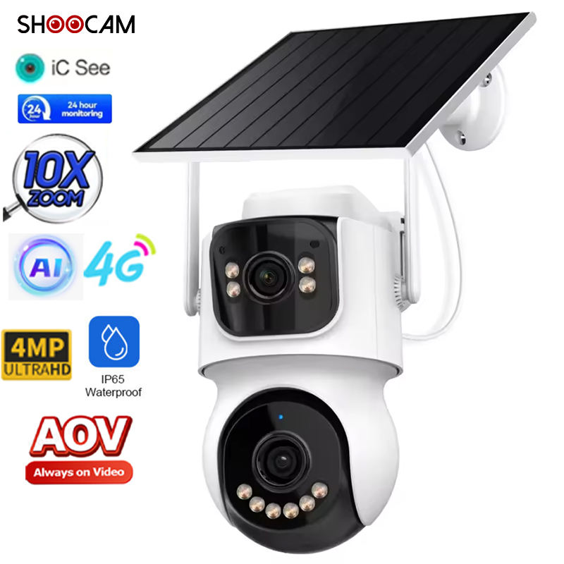 Cámara Solar PTZ 10X AOV 4MP para Exteriores, Grabación 24/7, Detección Humana, Audio Bidireccional, ICsee, Cámaras de Seguridad con Doble Lente y Energía Solar