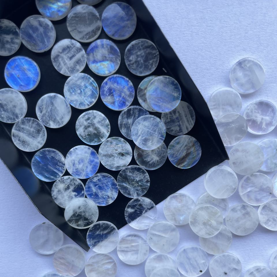Nombre del producto:10mm 20mm natural blanco Arco Iris Moonstone suave moneda forma discos planos
