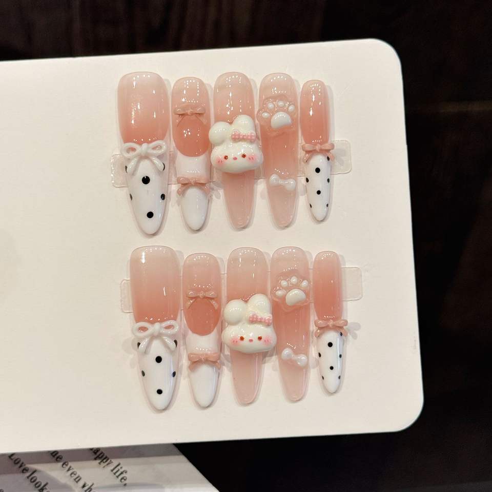 10 Uñas Postizas 3D con Diseño de Conejo, Punta Francesa Blanca, Rosa, Larga, Almendrada, Hechas a Mano, Decoración de Garras de Gato