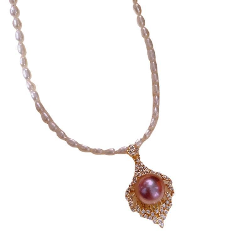 Collar de Perlas Edison Púrpuras de 11-12 mm con Colgante de Perlas de Arroz Pequeñas de 3-4 mm para Mujer, Chapado en Oro de 14k, Collares de Lujo