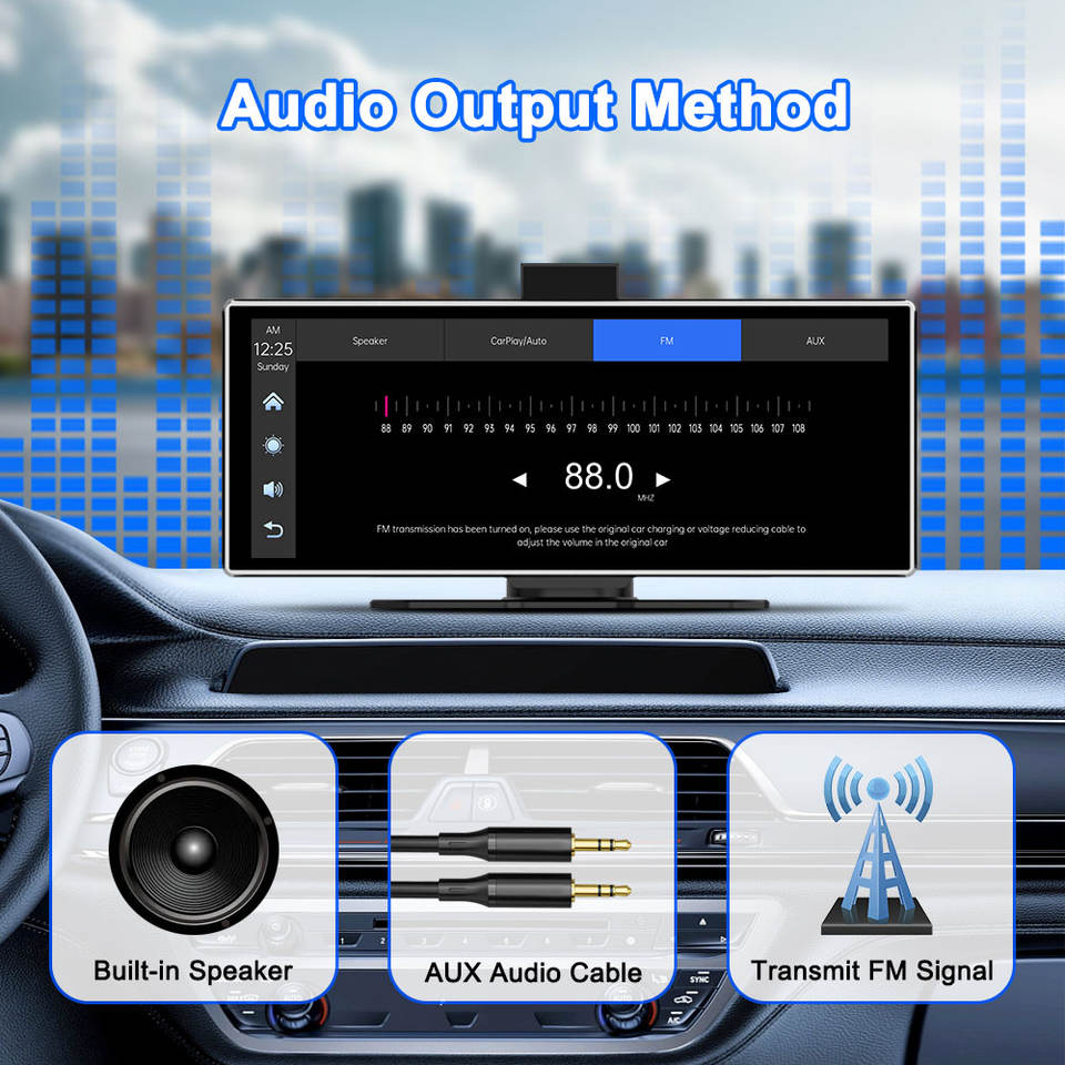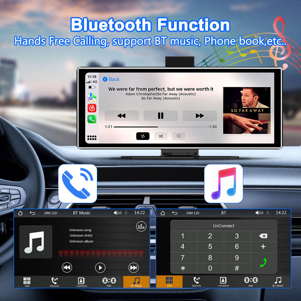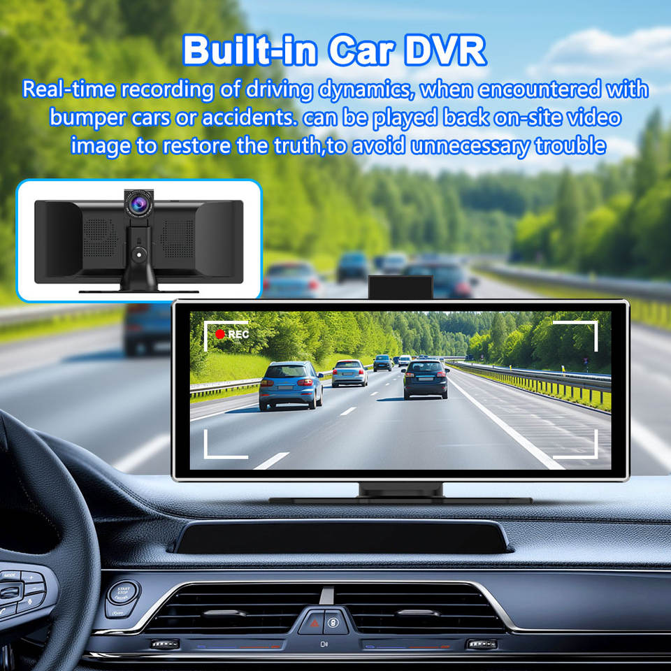 Función:GPS, Estéreo, DSP, CarPlay, Enlace espejo, Android auto, Administrador de archivos, Vista trasera y proyección de pantalla inalámbrica, Acceso a Internet por WiFi, Cámara frontal 4K+ cámara trasera 1080P, Admite entrada de vídeo de cámara y grabación., Admite software de transmisión de pantalla de Android, Admite carga rápida USB.