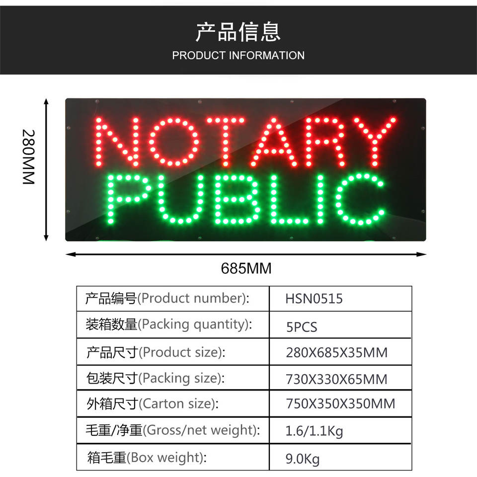 Nombre del producto:11 "x 27" brillante publicidad Notario Público edificio tienda signo animado