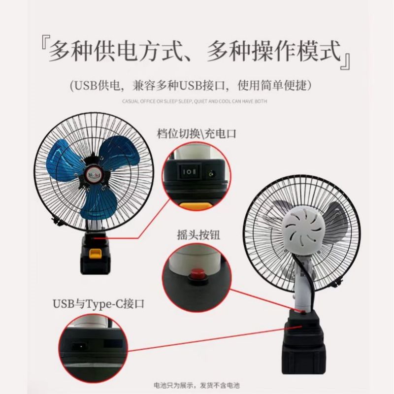 Ventilador Portátil de Mano de 11 Pulgadas con Batería de Litio, DC/AC/DC, Súper Potente, Función Giratoria, Fuente de Alimentación de Emergencia USB
