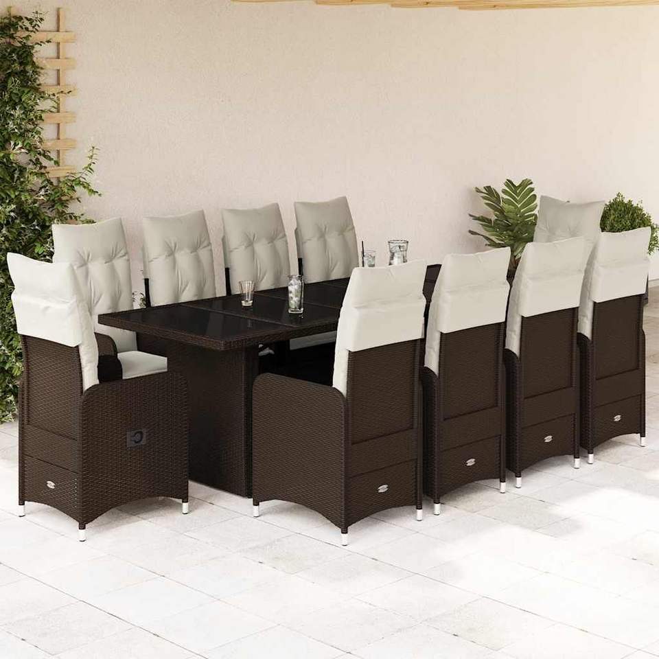 Conjunto de Bistro para Patio de 11 Piezas en Poliratán Marrón con Cojines, Conjuntos de Jardín