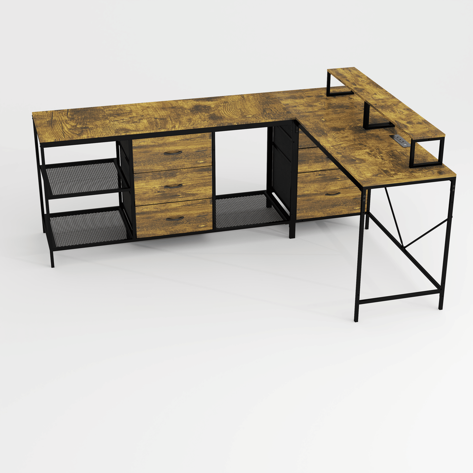 Escritorio Industrial para Computadora de 114 Pulgadas con Tomas de Corriente y USB C, Diseño en Forma de L, 6 Cajones de Tela, 3 Estantes Abiertos, Unidad Móvil