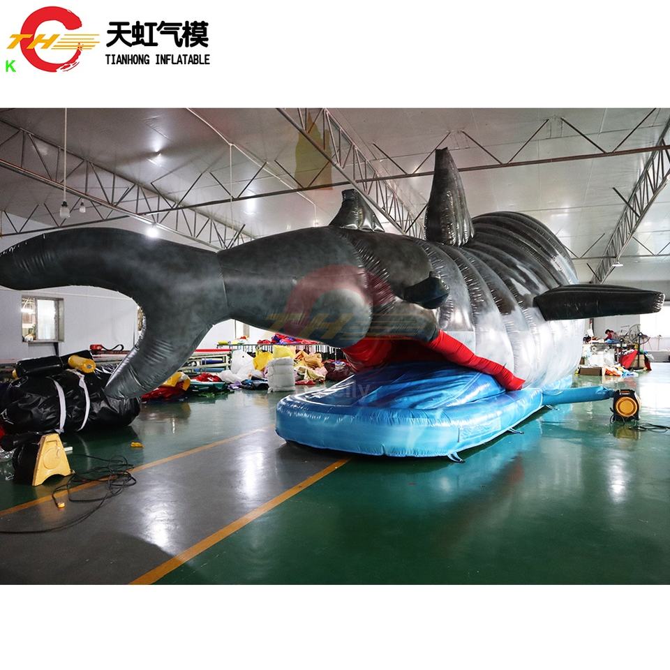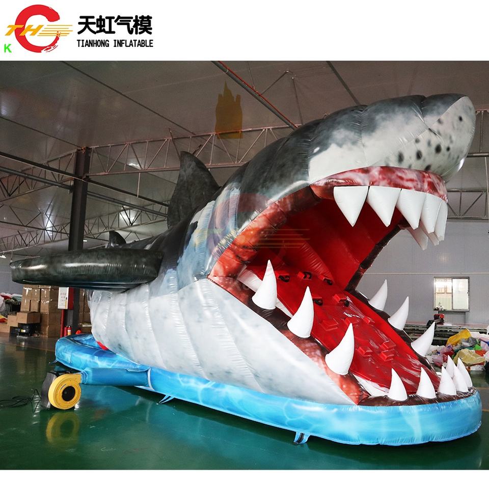 Tobogán de tiburón inflable gigante de 11m de largo, carrera de obstáculos inflable con boca de tiburón feroz, juego deportivo a la venta