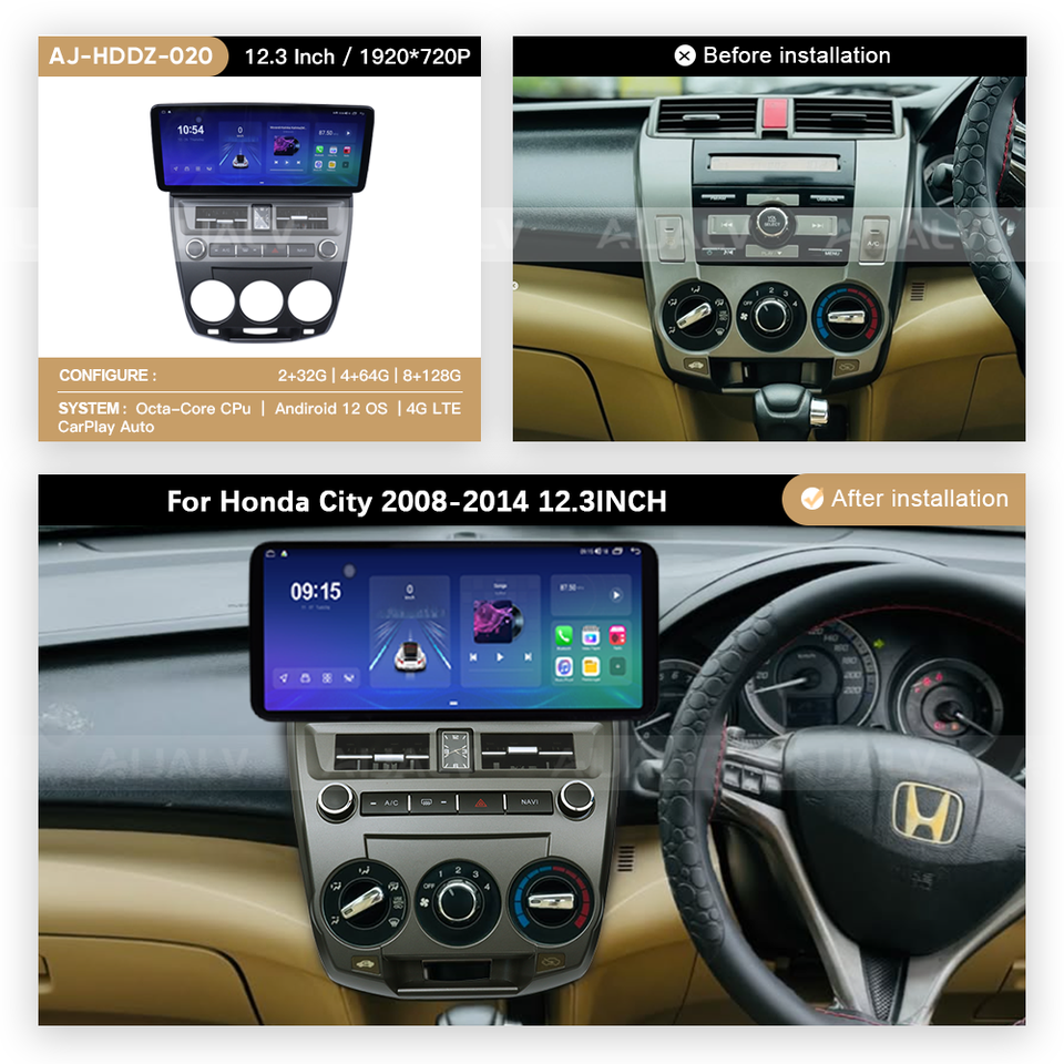 Unidad Principal de 12.3 Pulgadas con Pantalla Táctil Android Multimedia Carplay, Reproductor de Radio para Auto con DVD Estéreo para Honda City 2008-2014