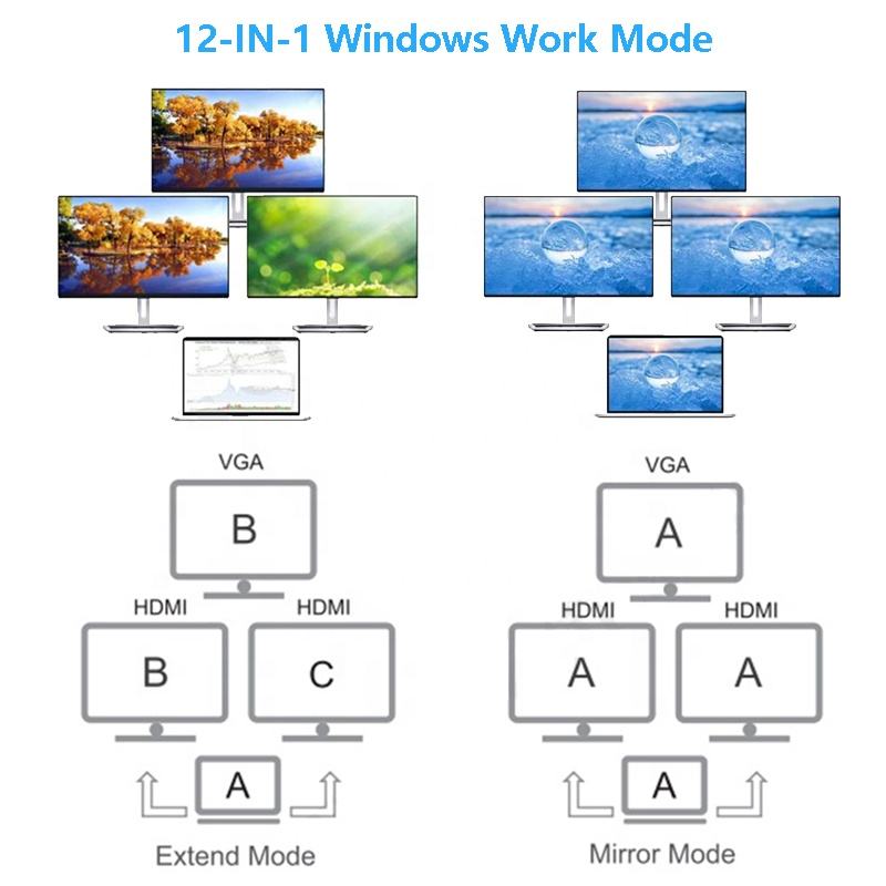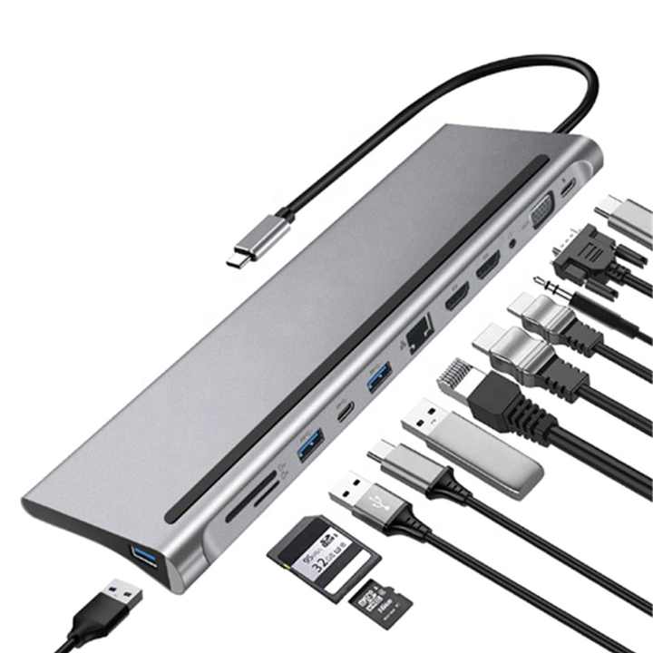3 * USB + SD/TF lector de tarjetas + tipo C + RJ45 + 2 * HDMI + 3,5 MM Audio + VGA + PD