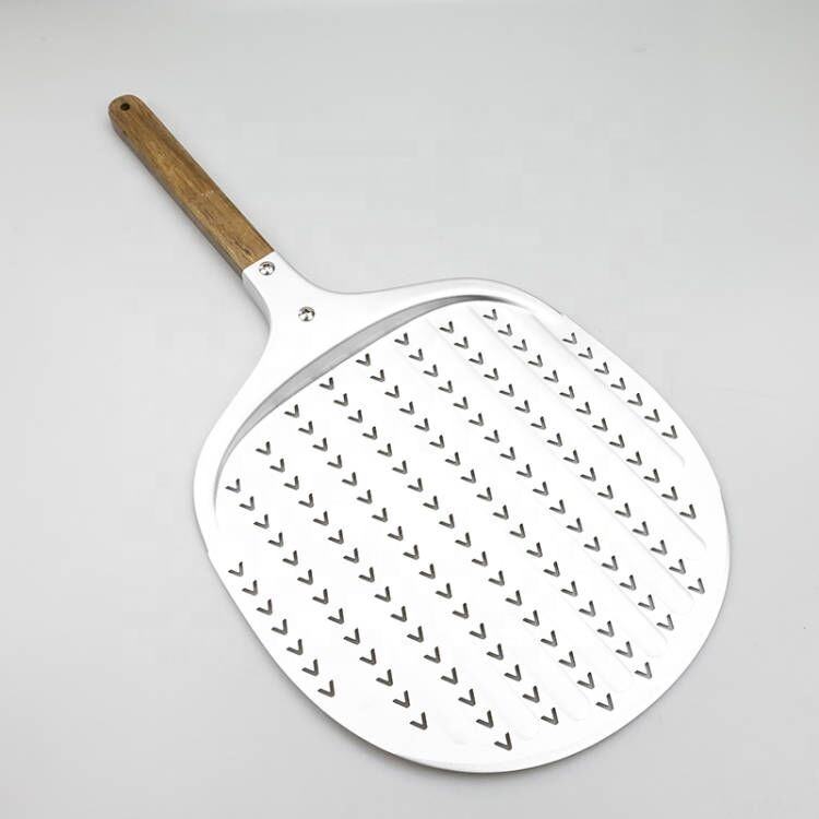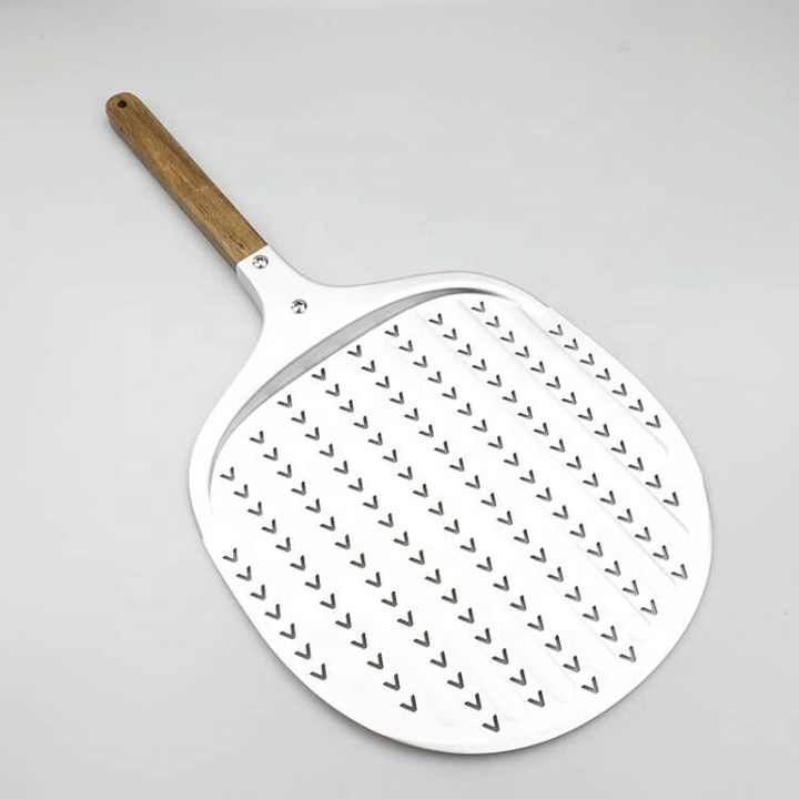 Cáscara de pizza de Aluminio perforado en forma de V anodizado de 12 pulgadas para pizza casera con mango desmontable