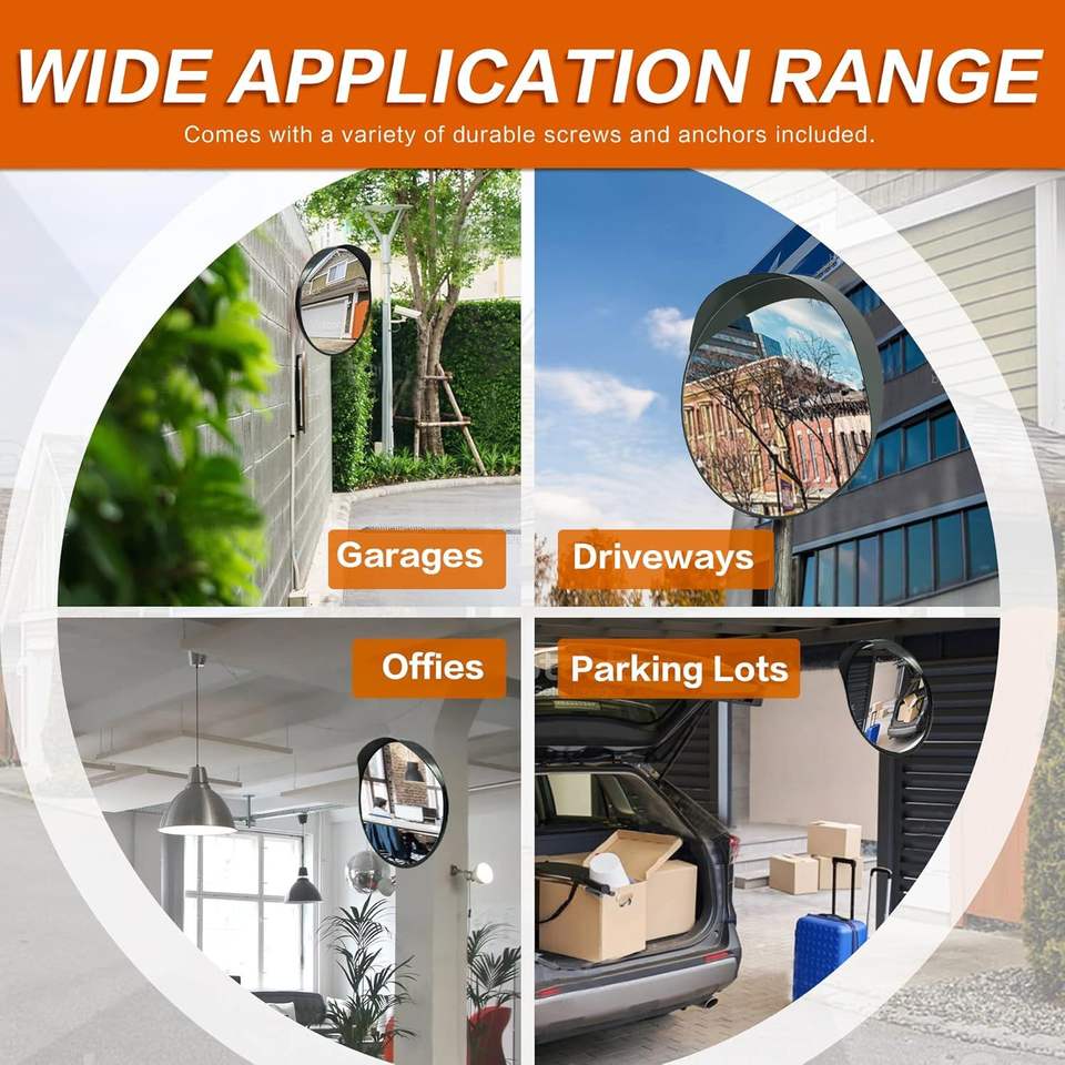 Espejo de Seguridad Convexo de 12 Pulgadas con Visión Clara y Soporte de Fijación Ajustable para Uso en Interiores y Exteriores