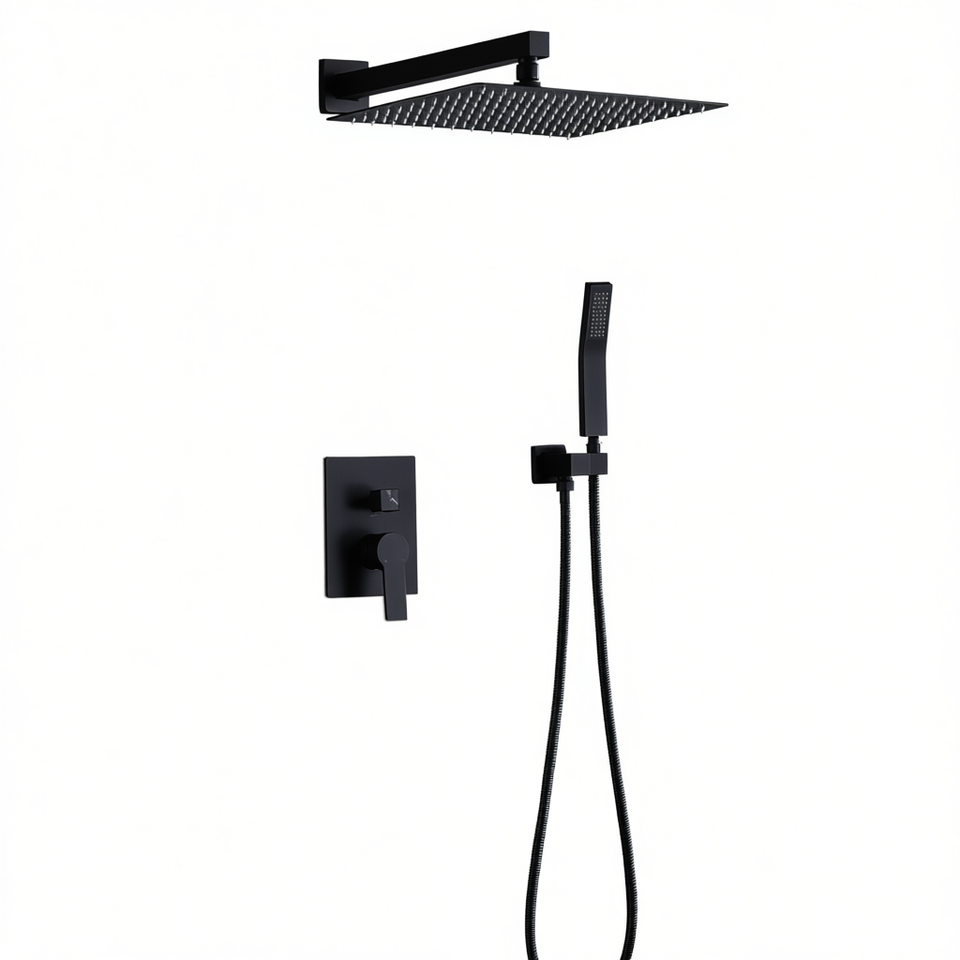 Juego de Ducha de Lluvia de 12 Pulgadas con Ducha de Mano, Montaje en Pared, Negro Mate, Diseño Minimalista para Baño