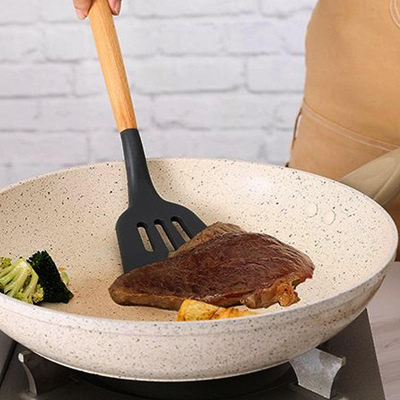 Juego de utensilios de cocina de 12 piezas con mango de madera de colores, utensilios de silicona de siete colores, kit esencial de suministros de cocina