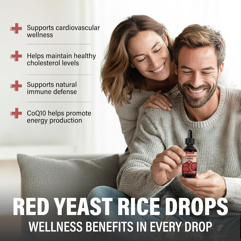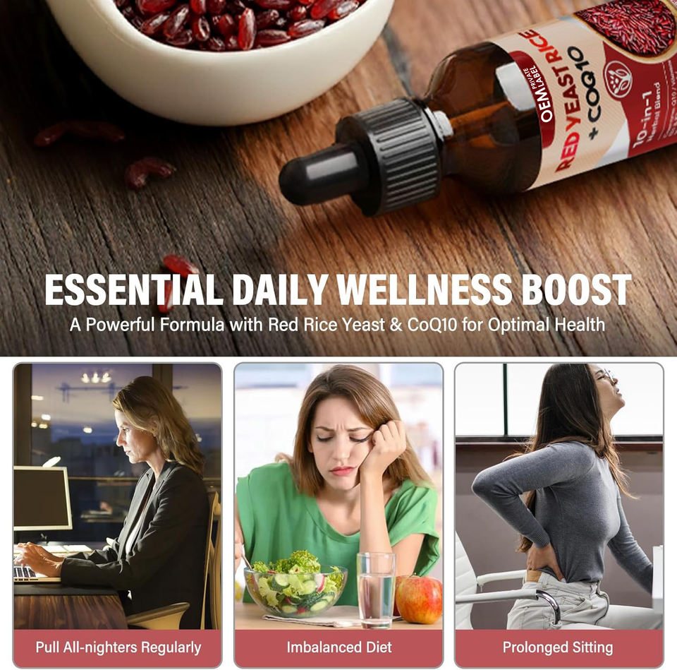Líquido de Levadura de Arroz Rojo de 1200 mg con CoQ10 en Gotas, Suplemento Saludable para el Corazón, Apoyo al Colesterol y la Circulación de Energía