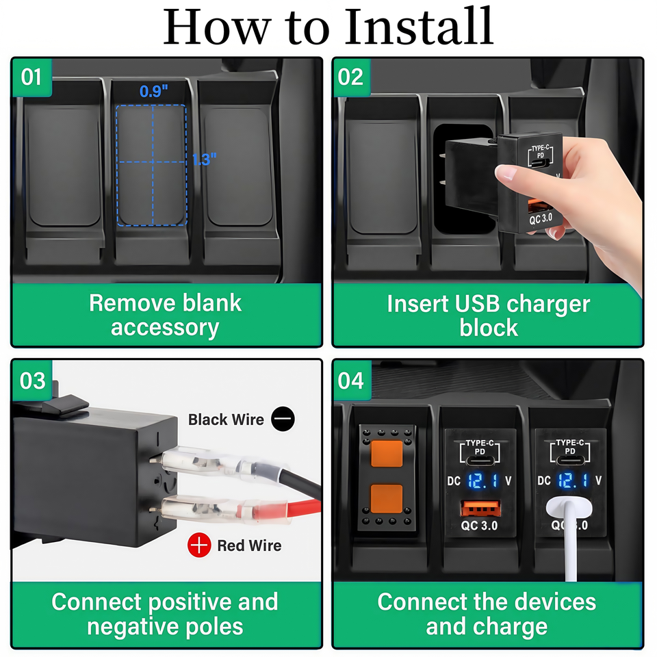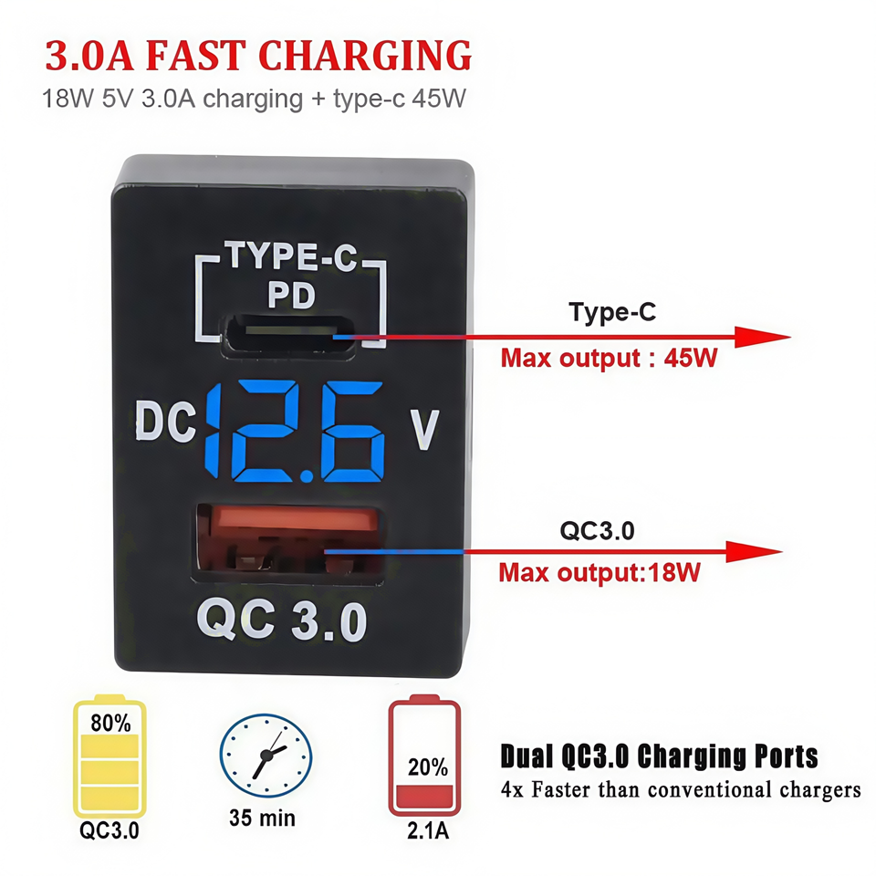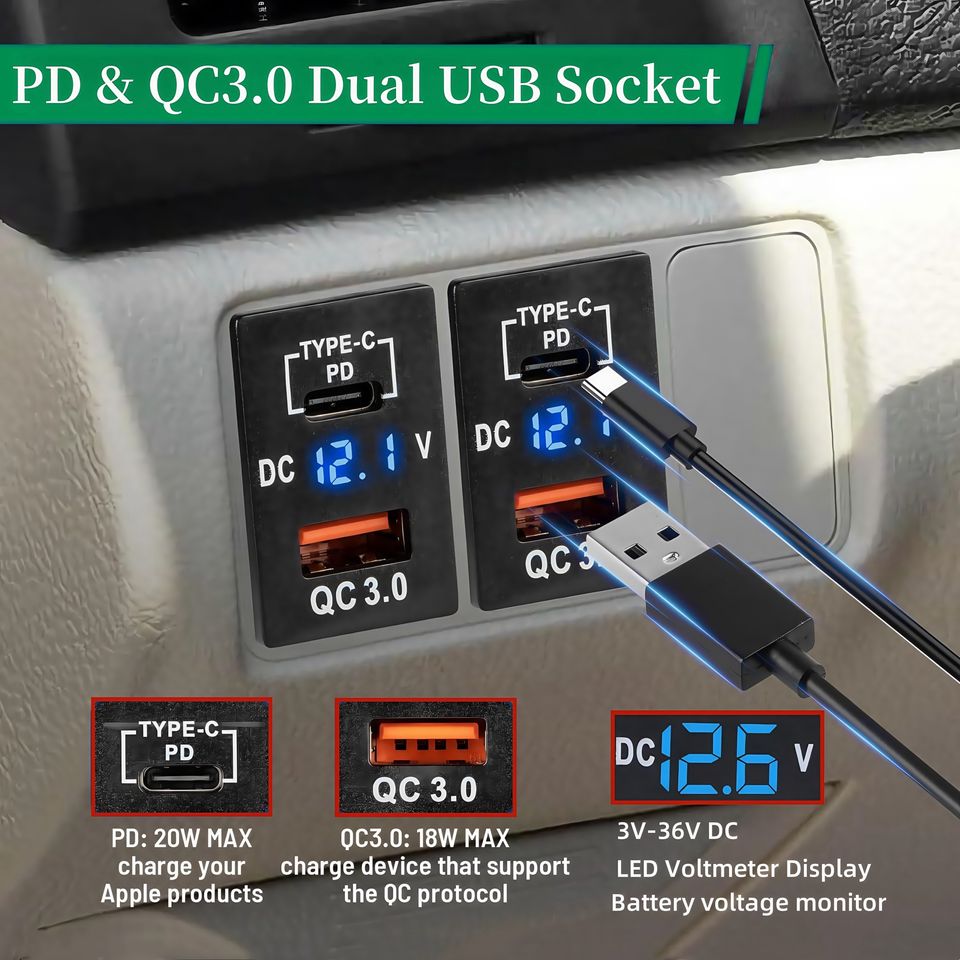 Enchufe de cargador de coche de 12V-24V con voltímetro QC3.0 PD tipo C Puerto USB adaptador de corriente toma de corriente USB Dual para Toyota 4runner Tacoma