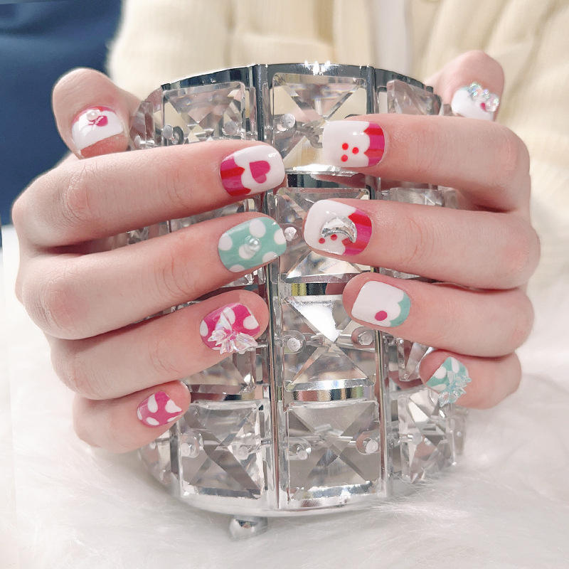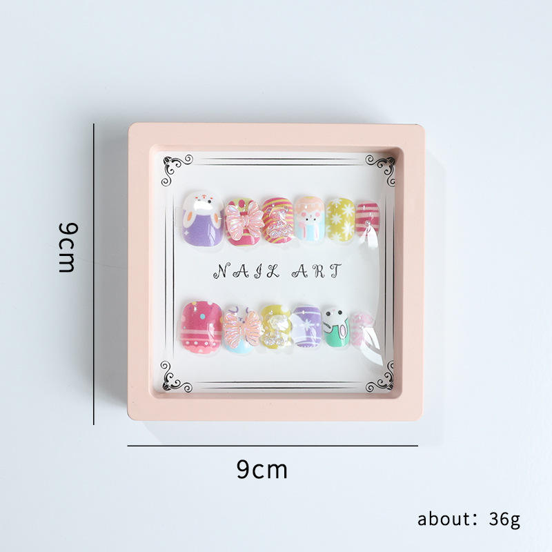 12 unids/caja de uñas postizas cortas hechas a mano, puntas de uñas acrílicas, bonita Prensa en uñas para niños y niñas