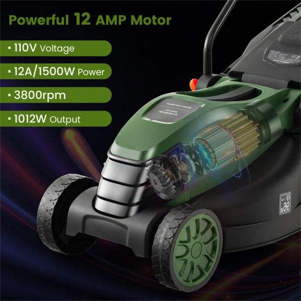 Cortacésped Eléctrico de 13.5 Pulgadas y 12 Amperios con Interruptores de Seguridad Dobles, Color Verde