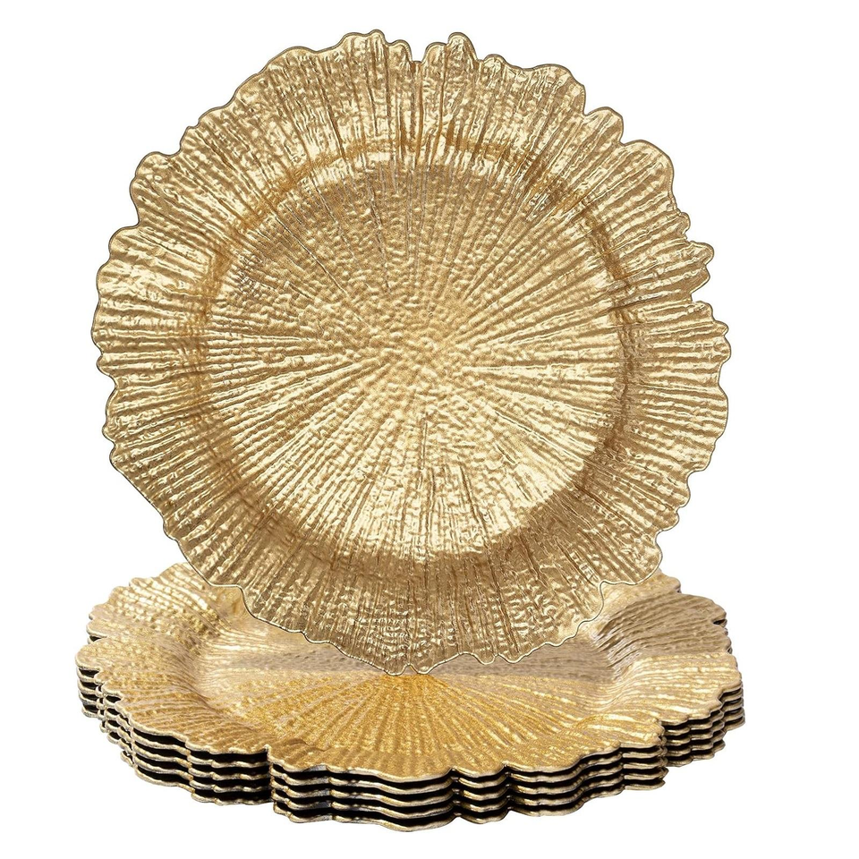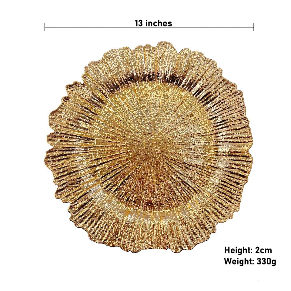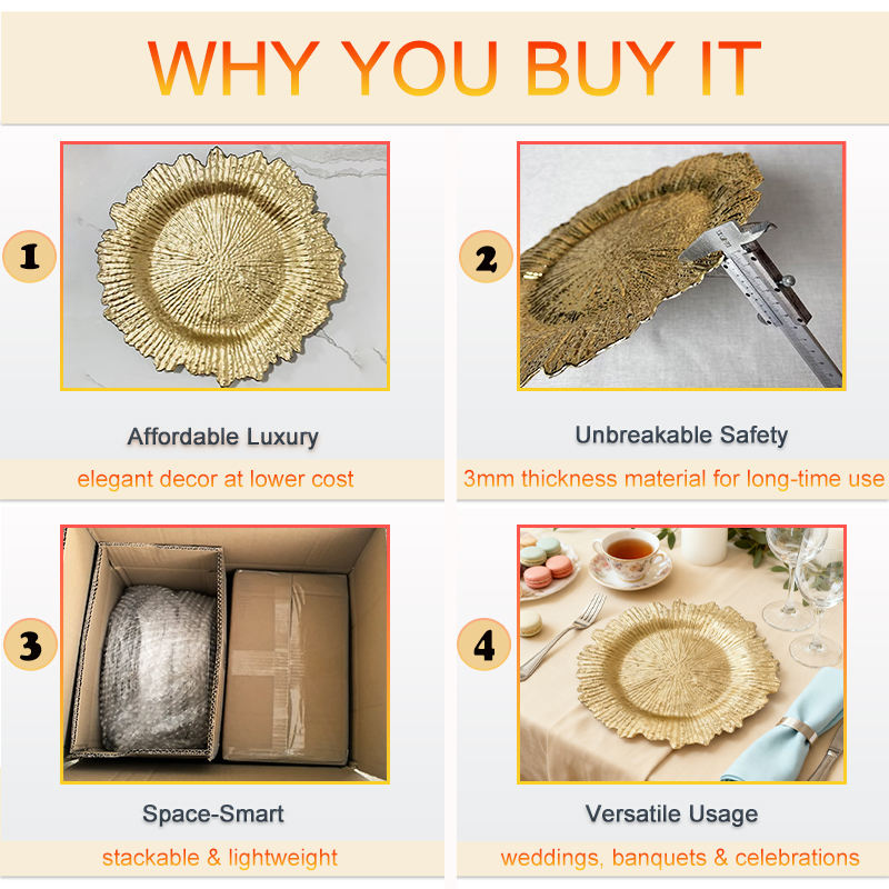 Platos Base de Plástico Dorados de 13 Pulgadas para Eventos, Platos Base Redondos Negros Tipo Reef al por Mayor para Platos de Cena de Boda