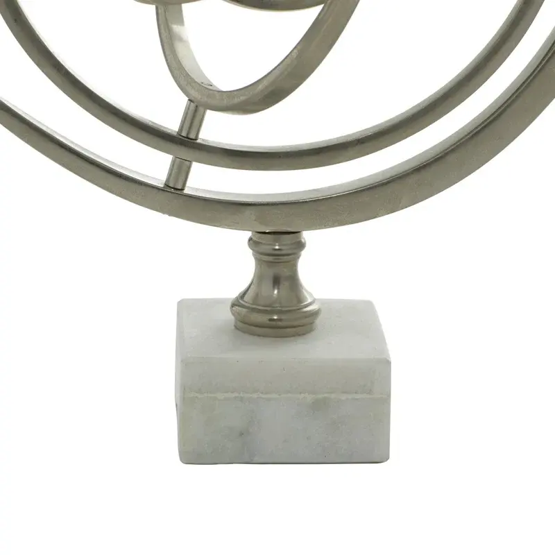 Globo decorativo armilar de aluminio plateado con base de mármol o escultura decorativa abstracta de metal de aluminio Deco
