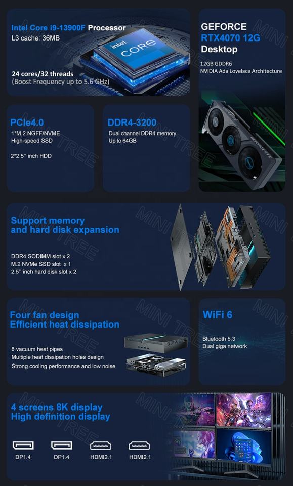 13TH Gen Mini PC Gamer I9 13900F I7 13700F I5 13400F RTX4060Ti 8G RTX4070 8G GDDR6 2 * DDR4 2LAN Win11 Pro Desktop Compute Mini PC