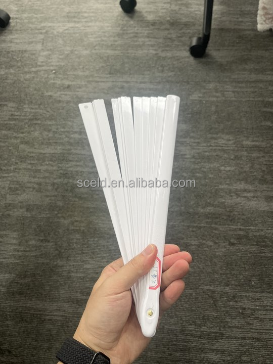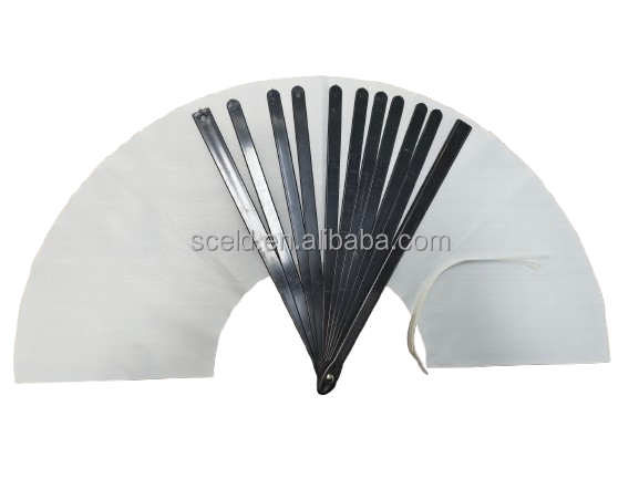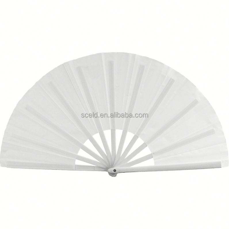 Abanico de mano plegable de tela de 33 cm (13 pulgadas) grande, blanco, para Line Dance, con varillas de plástico negras, en blanco para sublimación, con efecto sonoro.