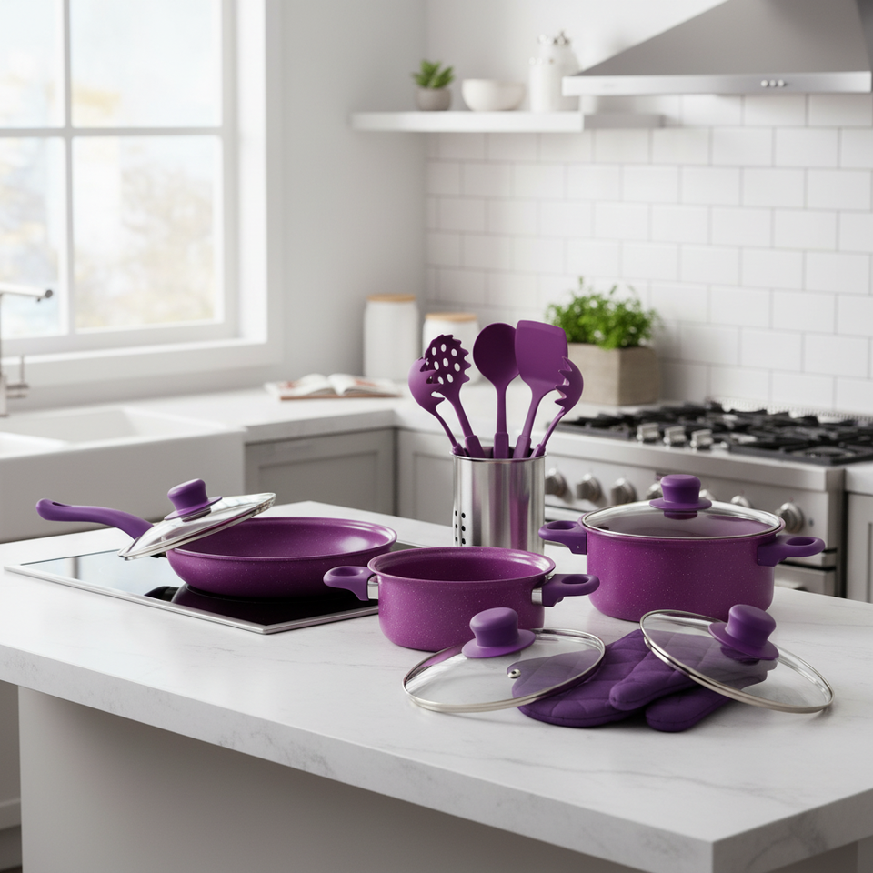 Juego de Ollas Modernas de Metal ONTECK de 14 Piezas, Color Morado, Antiadherentes, con Tapas de Vidrio y Revestimiento Cerámico para Estufas de Gas e Inducción