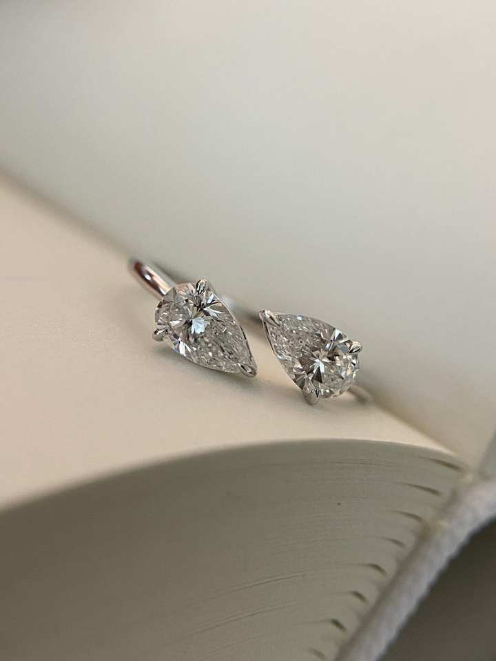 Anillo de dos piedras con vástago de derivación de oro de 14 quilates, banda abierta minimalista con pera de laboratorio, Diamante cultivado, compromiso, regalo de aniversario, fiesta de boda