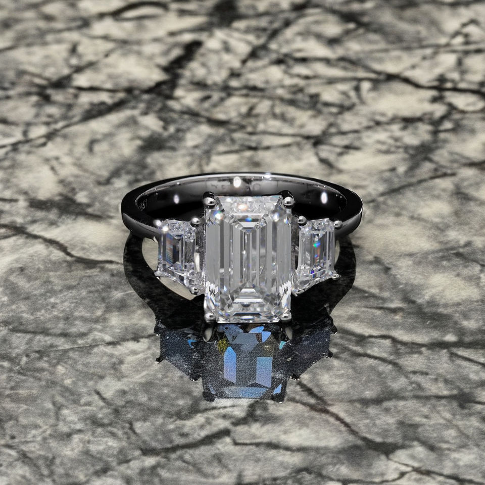 Anillo de diamantes CVD de oro de 14 quilates con centro de corte esmeralda de 3 quilates y diamantes de corte lateral elegante diseño de tres piedras