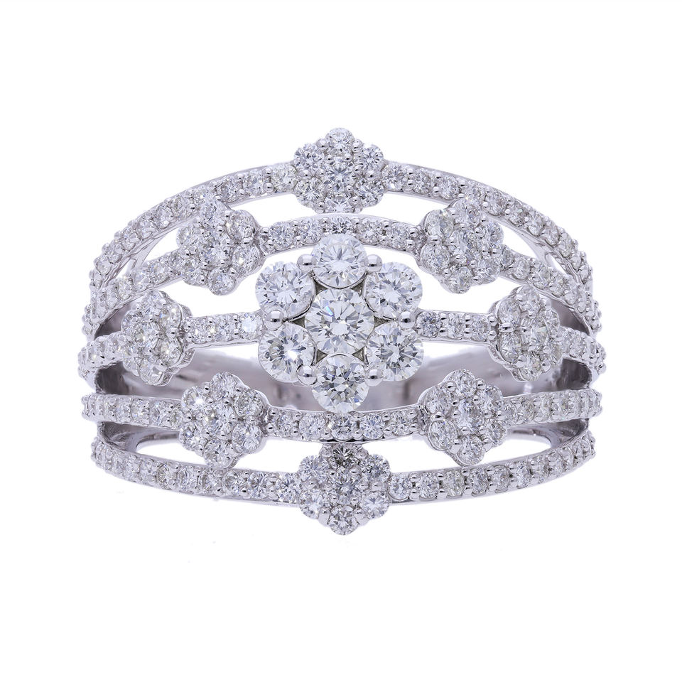 Anillo Clásico de Varias Filas Chapado en Oro de 14K con Rodio, Diseño Floral Intrincado con Trabajo Calado y Exquisitos Diamantes Engastados en Pavé
