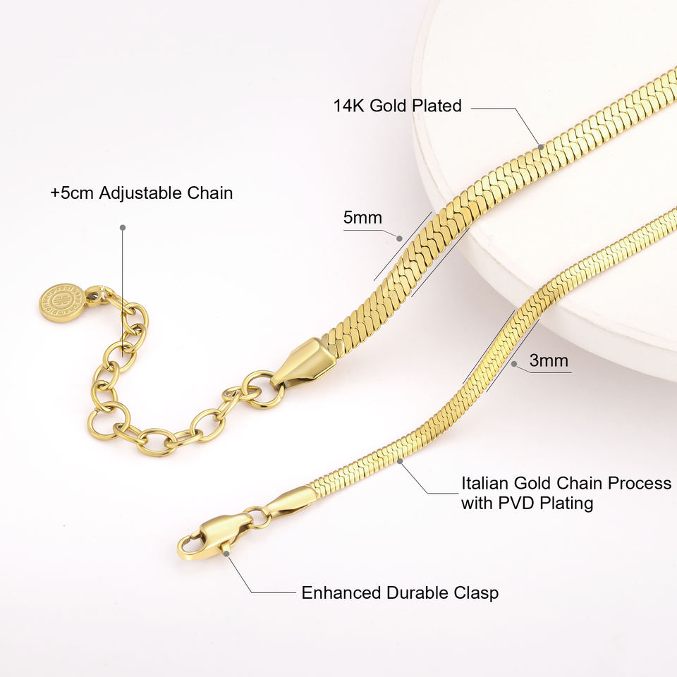 Gargantilla chapada en oro real 14K, cadena tipo serpiente de 3 mm en acero inoxidable, plana estilo espiga, delicada joyería de moda para mujer y hombre