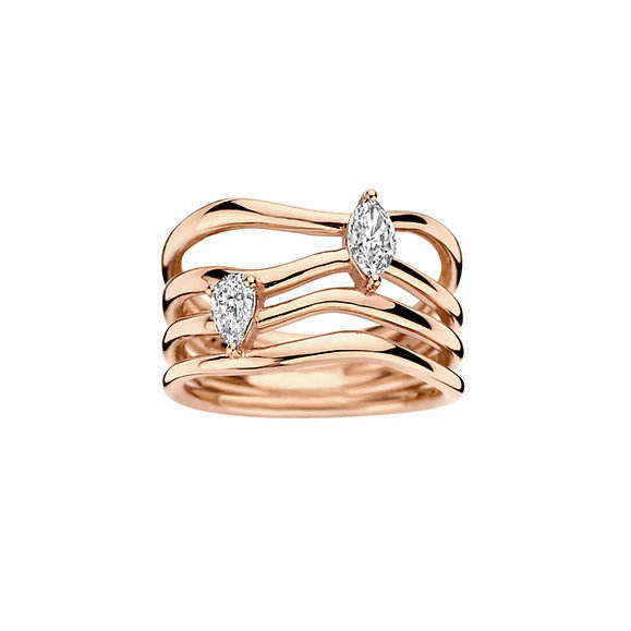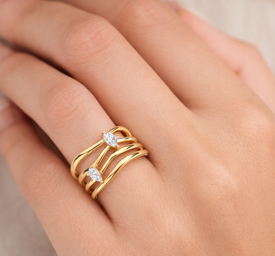 Anillo de Oro Sólido de 14K con Diamantes Cultivados en Laboratorio, Diseño de Ondas Múltiples, Corte Marquesa, Anillo de Banda Elegante y Lujoso para Mujer, Joyería Fina