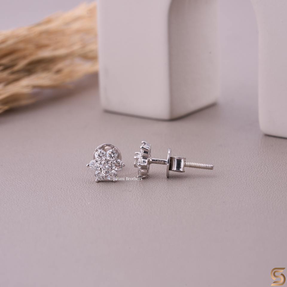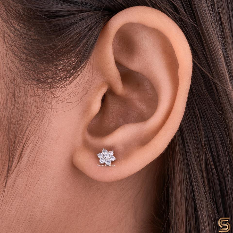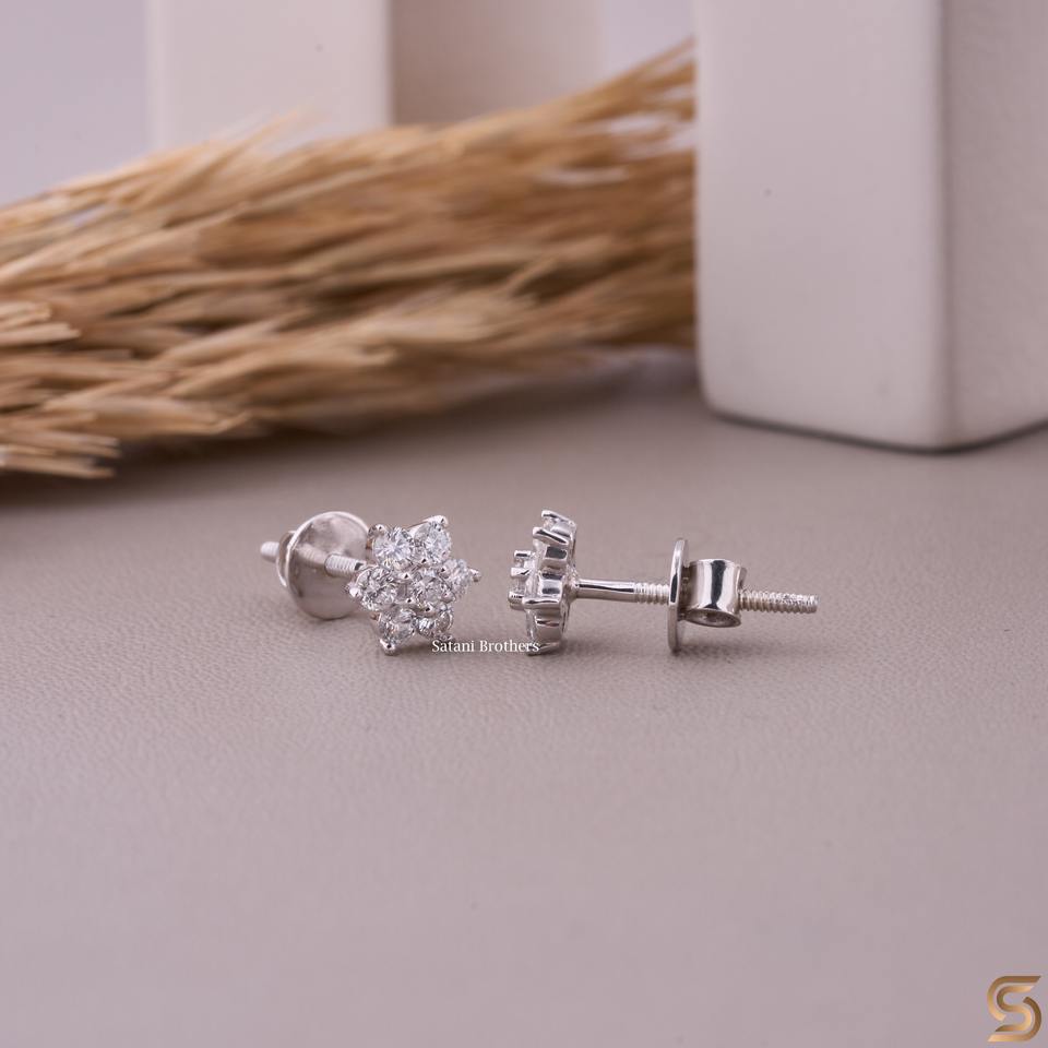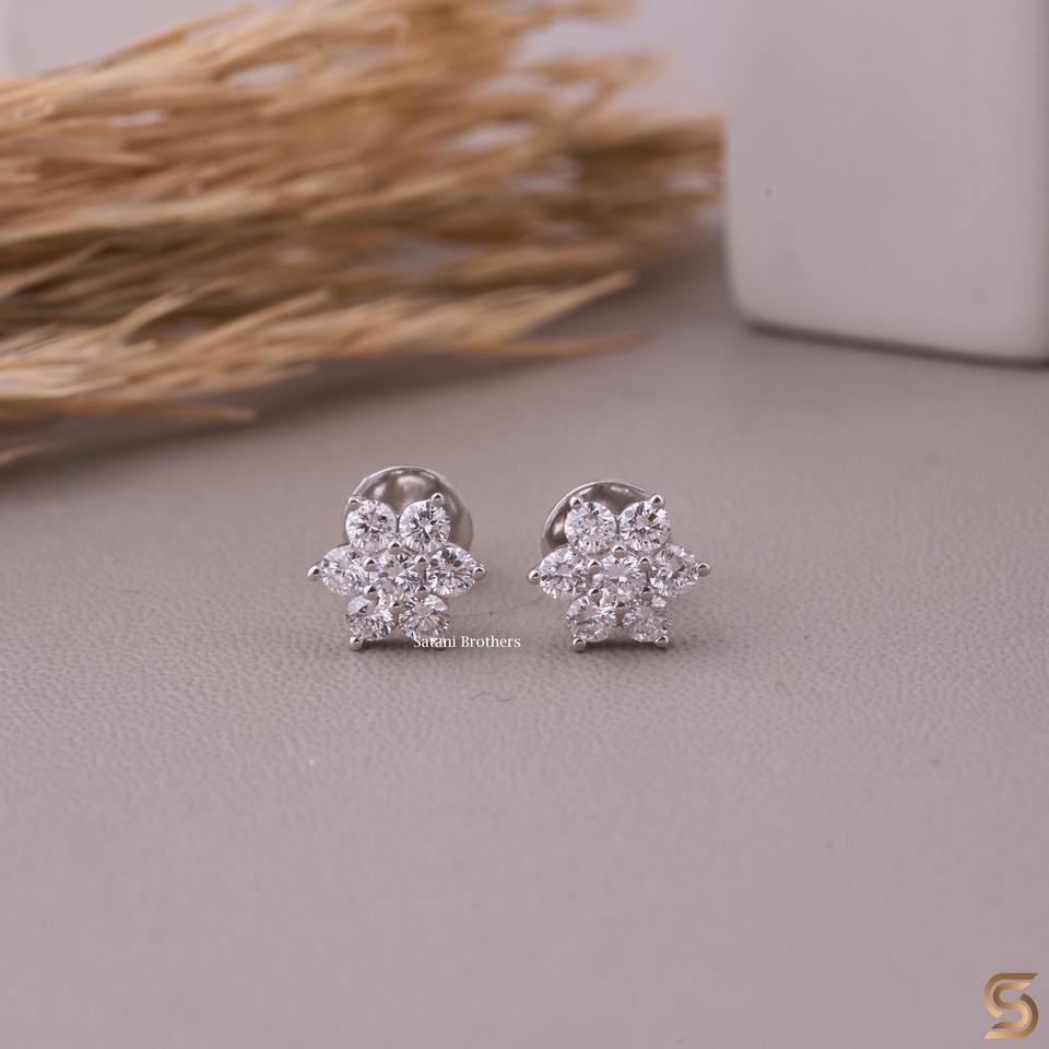 Pendientes de Oro Blanco de 14K con Diseño de Flor y Diamantes de Laboratorio | Pendientes de Diamantes en Racimo de 0.36 CT