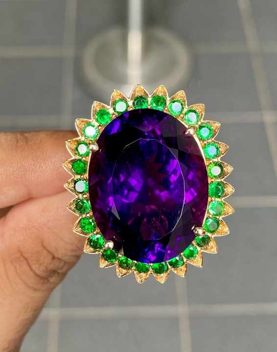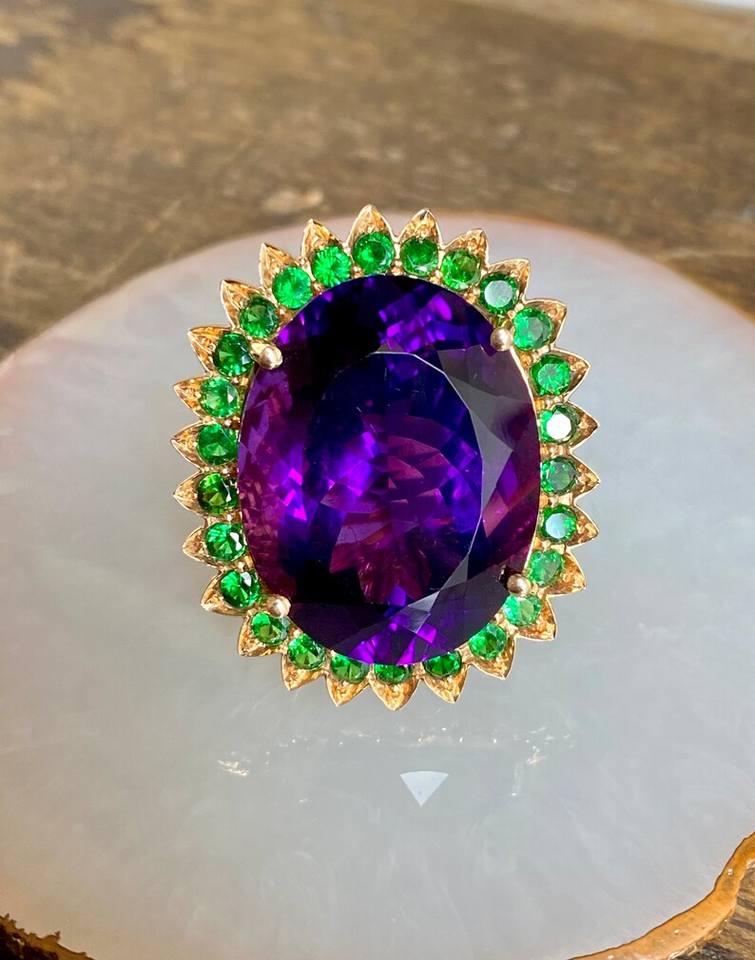 14K Oro amarillo Amatista con Esmeralda Anillo Joyas de piedras preciosas únicas