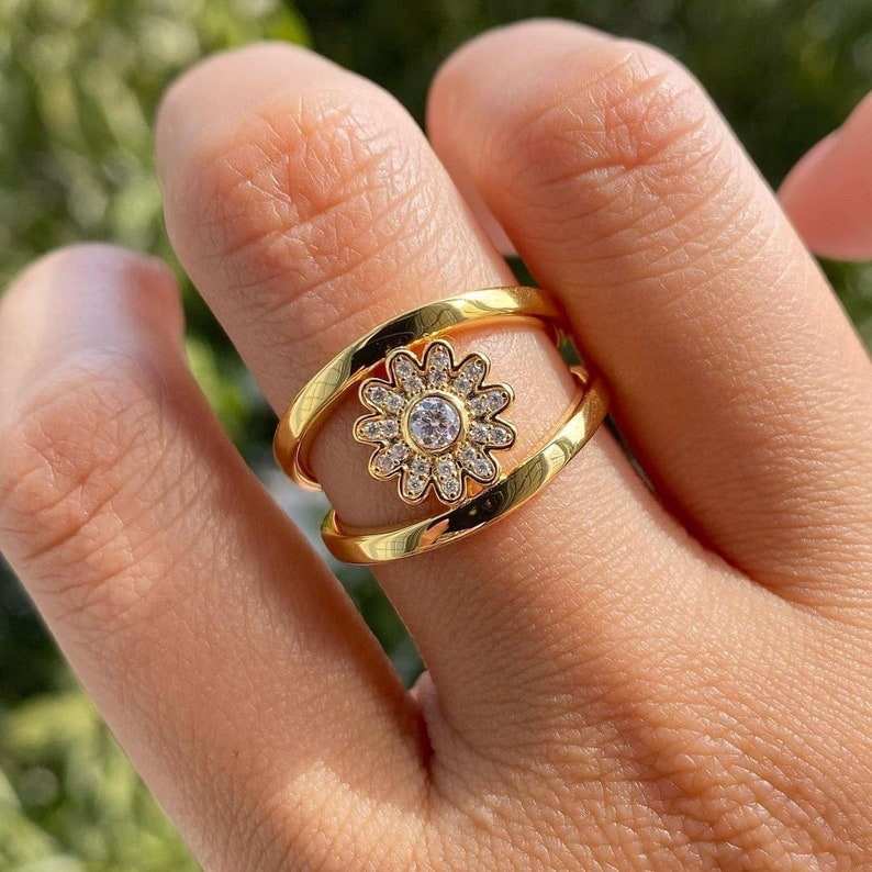 Anillo de flores de oro amarillo de 14 quilates, anillo de doble banda de diamante cultivado en laboratorio de corte redondo para boda, compromiso, aniversario, regalo de fiesta fina