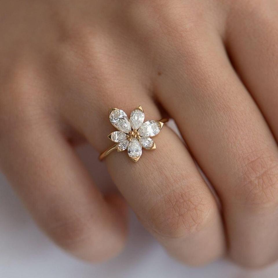 Anillo de Flor de Oro Amarillo de 14K con Diamantes Cultivados en Laboratorio, Pétalos de Diamante Corte Pera, Centro de Diamante Amarillo, Certificado IGI, Anillo Botánico