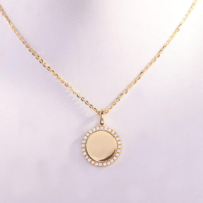 14K oro amarillo Simple círculo placa forma diamante colgante collar joyería Real diamante colgante collar con halo de diamante