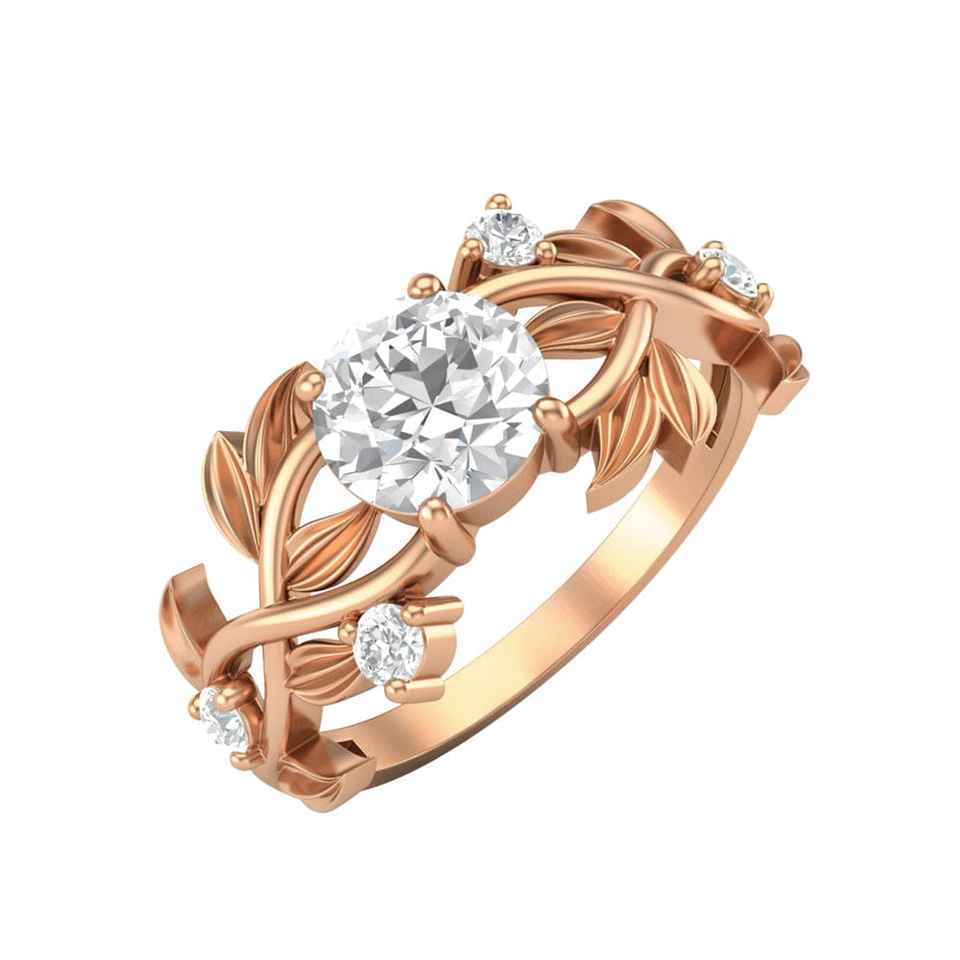 Anillo de compromiso de oro blanco de 14K con corte redondo VVS MOissanite hoja de diamante y diseño de motivo de vid joyería de moda