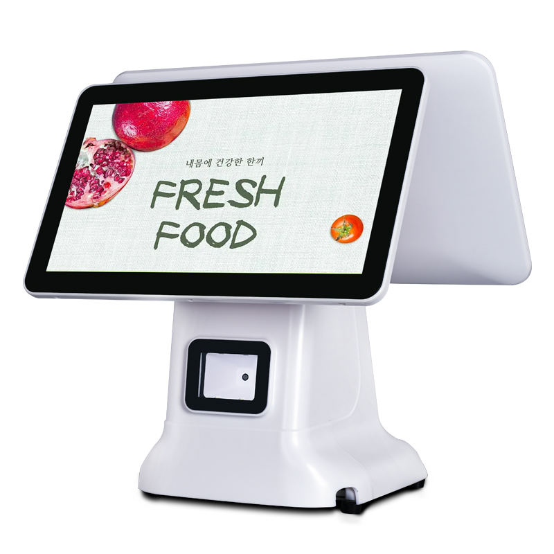 Sistema POS de escritorio para PC industrial con pantalla dual de 15.6 pulgadas, con escáner de código 2D e impresora integrados.
